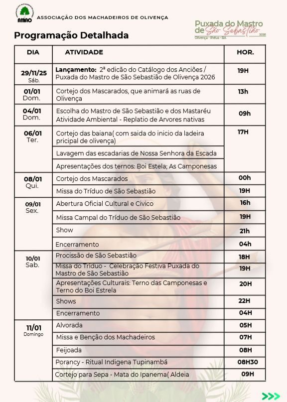 Olivença vive dias de intensa movimentação cultural e religiosa com a proximidade da Festa da Puxada do Mastro, uma das manifestações mais antigas e simbólicas de Ilhéus. Com mais de três séculos de história, a celebração marca oficialmente o início dos festejos em homenagem a São Sebastião e mobiliza moradores, fiéis e visitantes.
